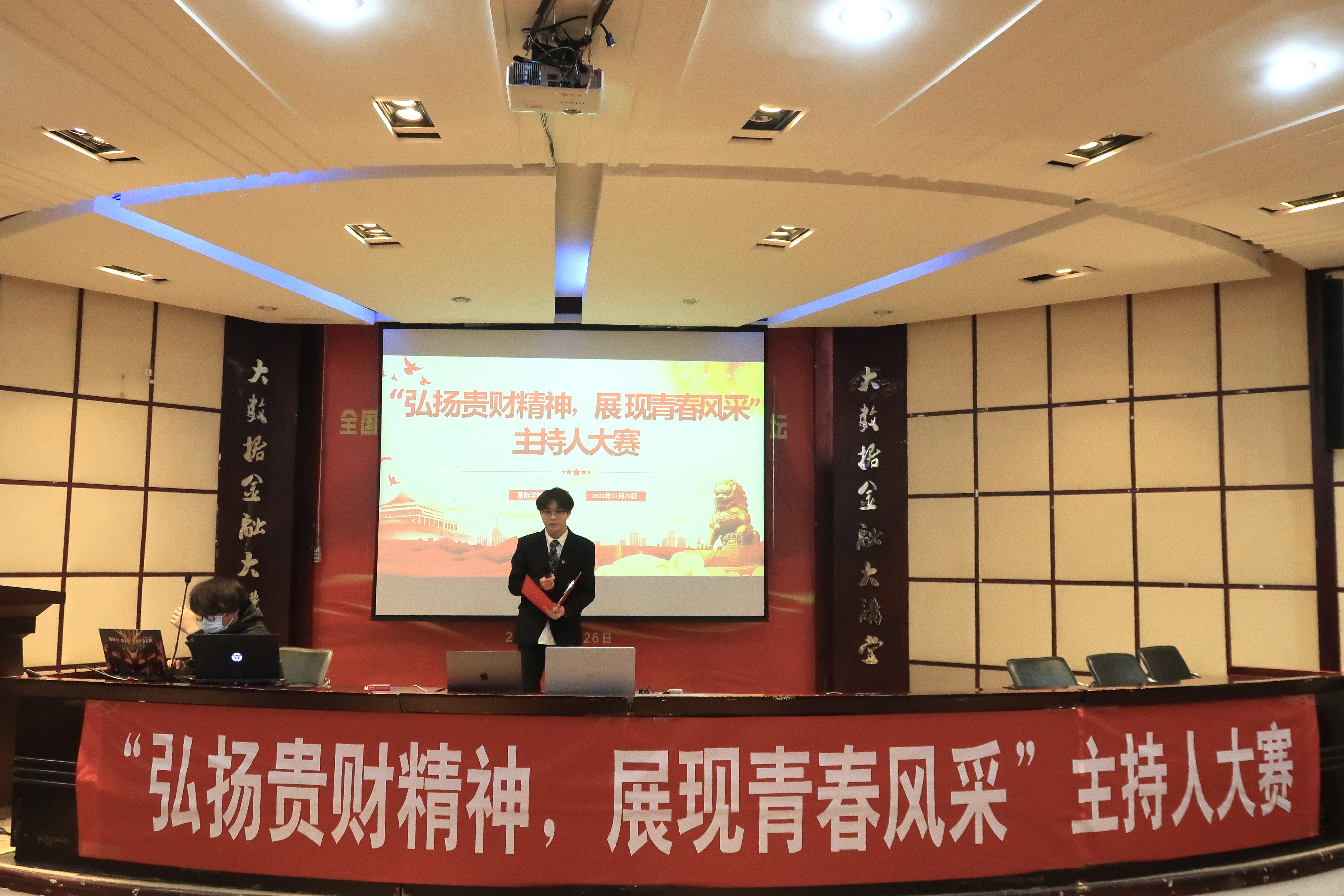 (TapTap 陈星妹 报道|摄影 周阳梦)为丰富同学们的校园生活,锻炼同学们的演讲能力,12月1日,TapTap在鹿冲关校区大数据报告厅举办“弘扬贵财精神,展现青春风采”主持人大赛。